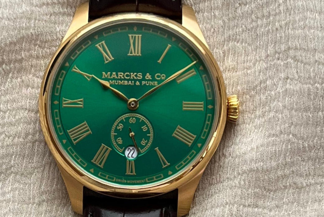 Royal gold lettering on a rich green sun brushed dial. The Nizam pays homage to the rulers of Hyderabad, once major patrons of Marcks & Co. fine watch making.