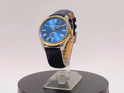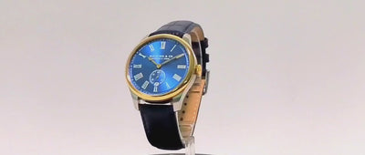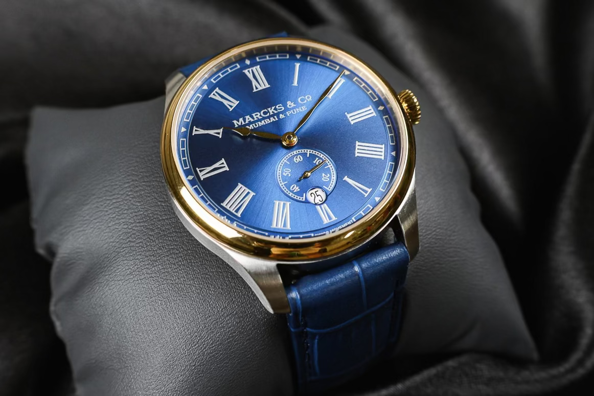 Regal blue sun brushed dial with gold hands and a bi-color case. The Raja takes inspiration from the elegant sapphire jewelry of Indian kings.