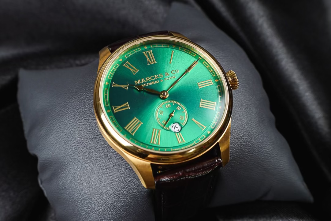 Royal gold lettering on a rich green sun brushed dial. The Nizam pays homage to the rulers of Hyderabad, once major patrons of Marcks & Co. fine watch making.